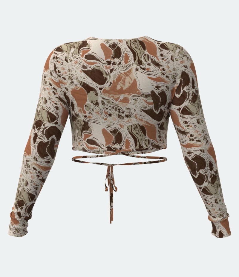 Blusa Cropped em tule com estampa abstrata e amarração ao corpo